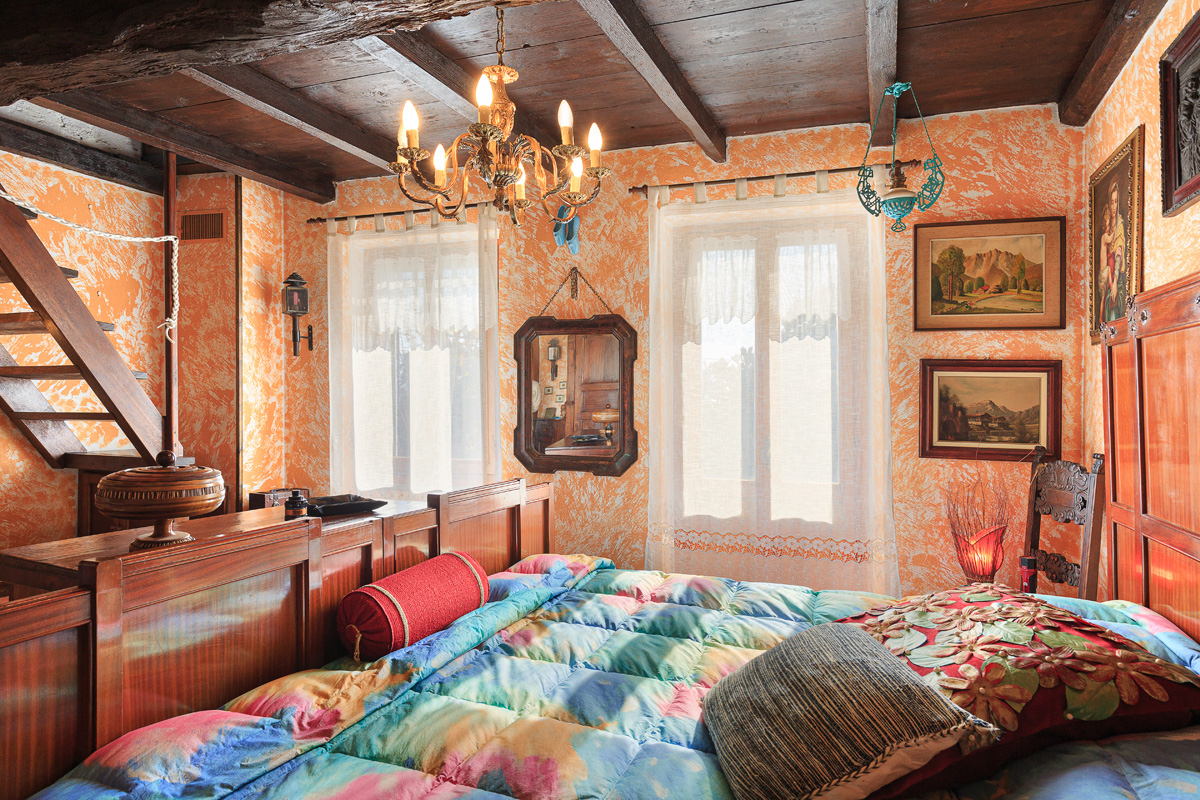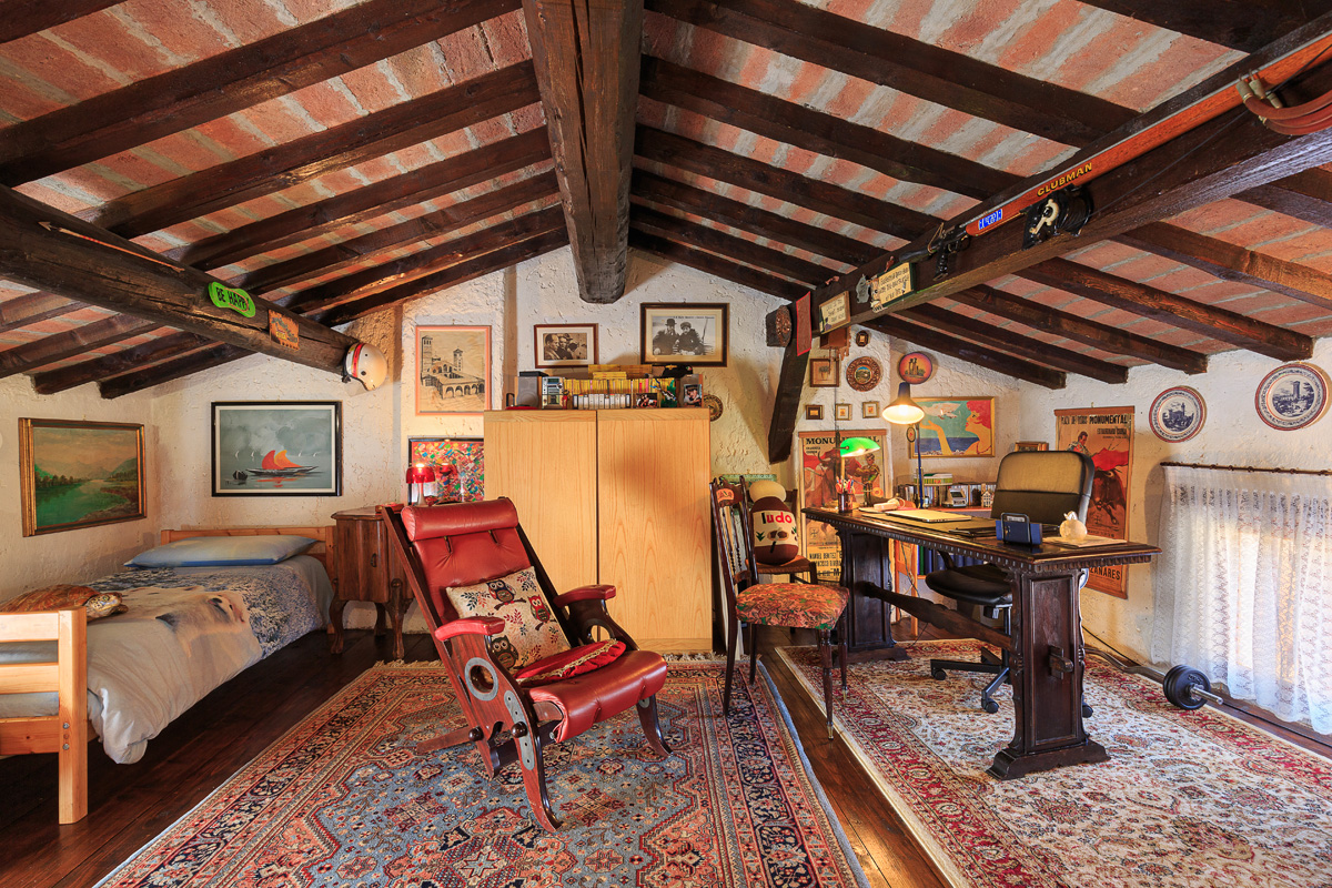 La zona notte al primo piano offre tre ampie camere e un bagno disimpegnato. La camera padronale si dispone su due livelli, offrendo così al secondo livello uno spazio come un rifugio, ampio, da utilizzare a piacimento, oggi uno studio riservato.