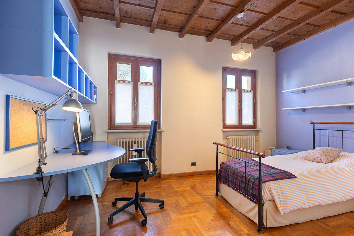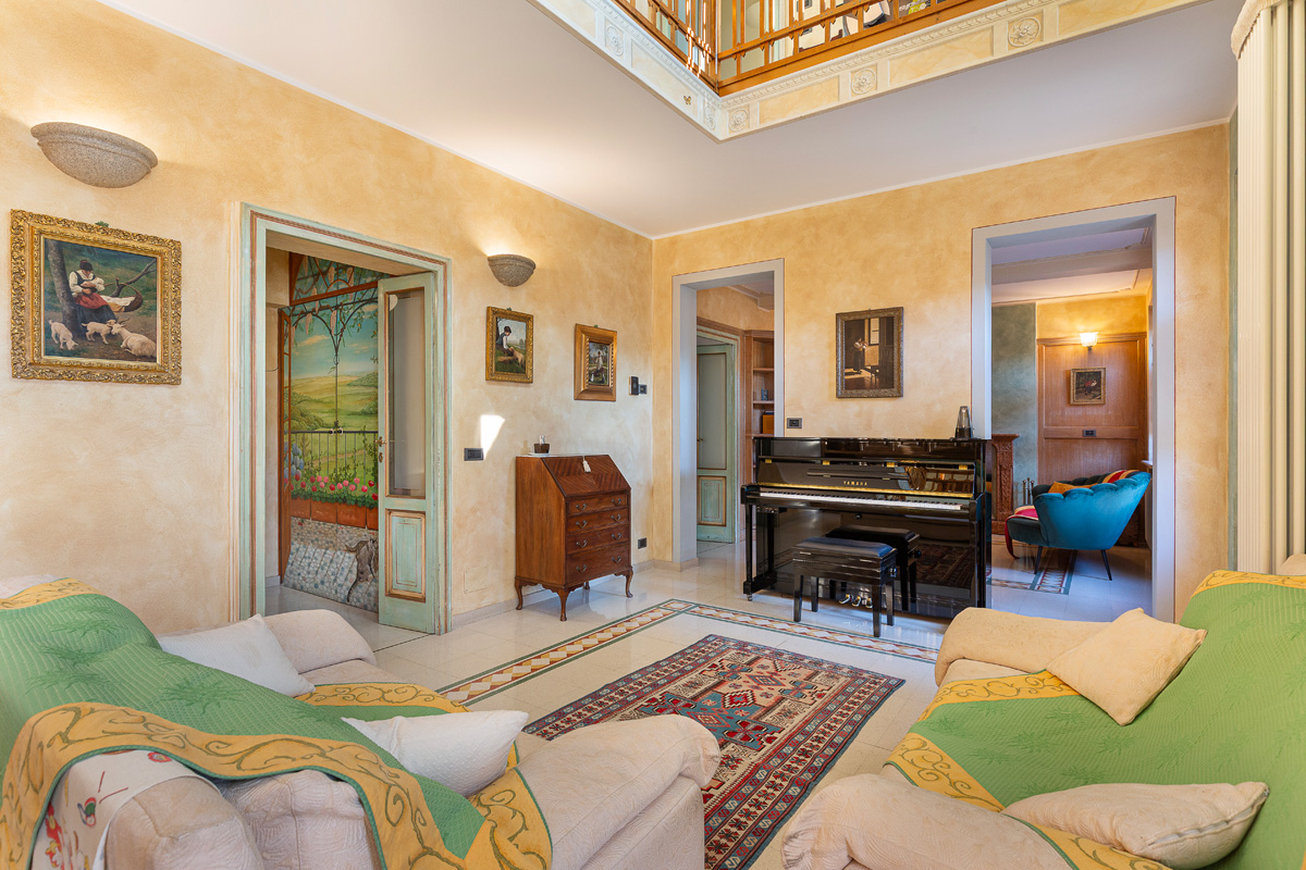 La scelta di lasciare a vista a tutt’altezza il soggiorno cosi da creare una zona di carattere, mettendo in evidenza i particolari architettonici come la decorazione del soffitto e la balconata ricavata su misura con il legno di una antica scala, donano con i vetri cattedrale. Dal soggiorno saliamo al primo piano, attraversiamo la balconata con particolari parapetti in legno e lavorazioni alla zona notte. Da qui accediamo anche ad un balcone con affaccio sul giardino. Disponiamo di tre camere ognuna con cabina armadio di cui una con bagno privato arredato in stile pregiato; altro bagno disimpegnato al servizio delle altre camere sempre con finiture ricercate.