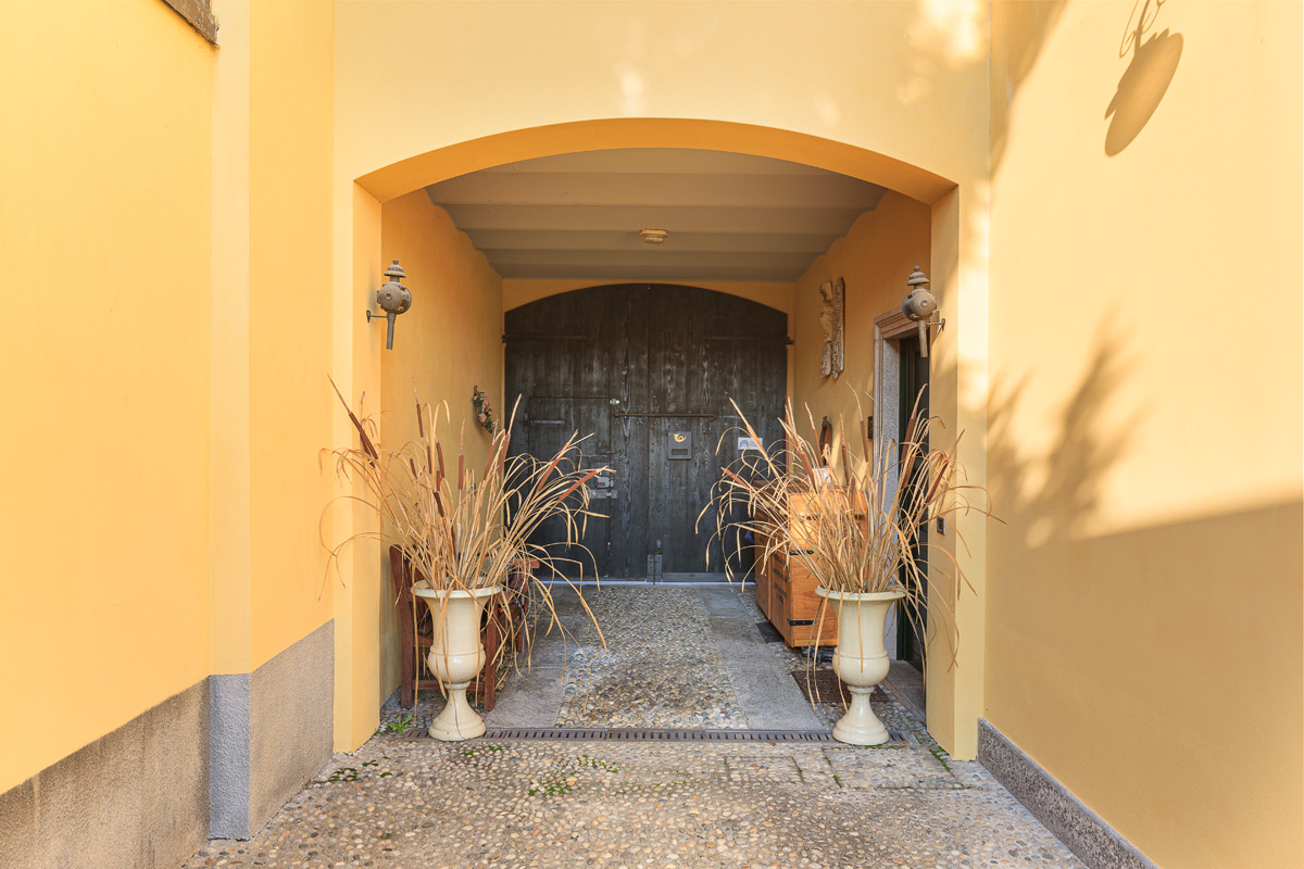 Appena varcato l’ingresso dall’androne rimaniamo già piacevolmente colpiti, il grande portone in legno, il ciottolato e la vista del giardino. L’edificio rimane su due livelli dove al piano terra troviamo la cucina, il soggiorno, un locale studio, un bagno e una piccola lavanderia. Sorprende la distribuzione degli spazi al piano terra studiata collegando i vari ambienti in modo funzionale. Le porte finestre connettono il giardino come fosse parte del living della casa, oltre a rendere gli ambienti molto luminosi.